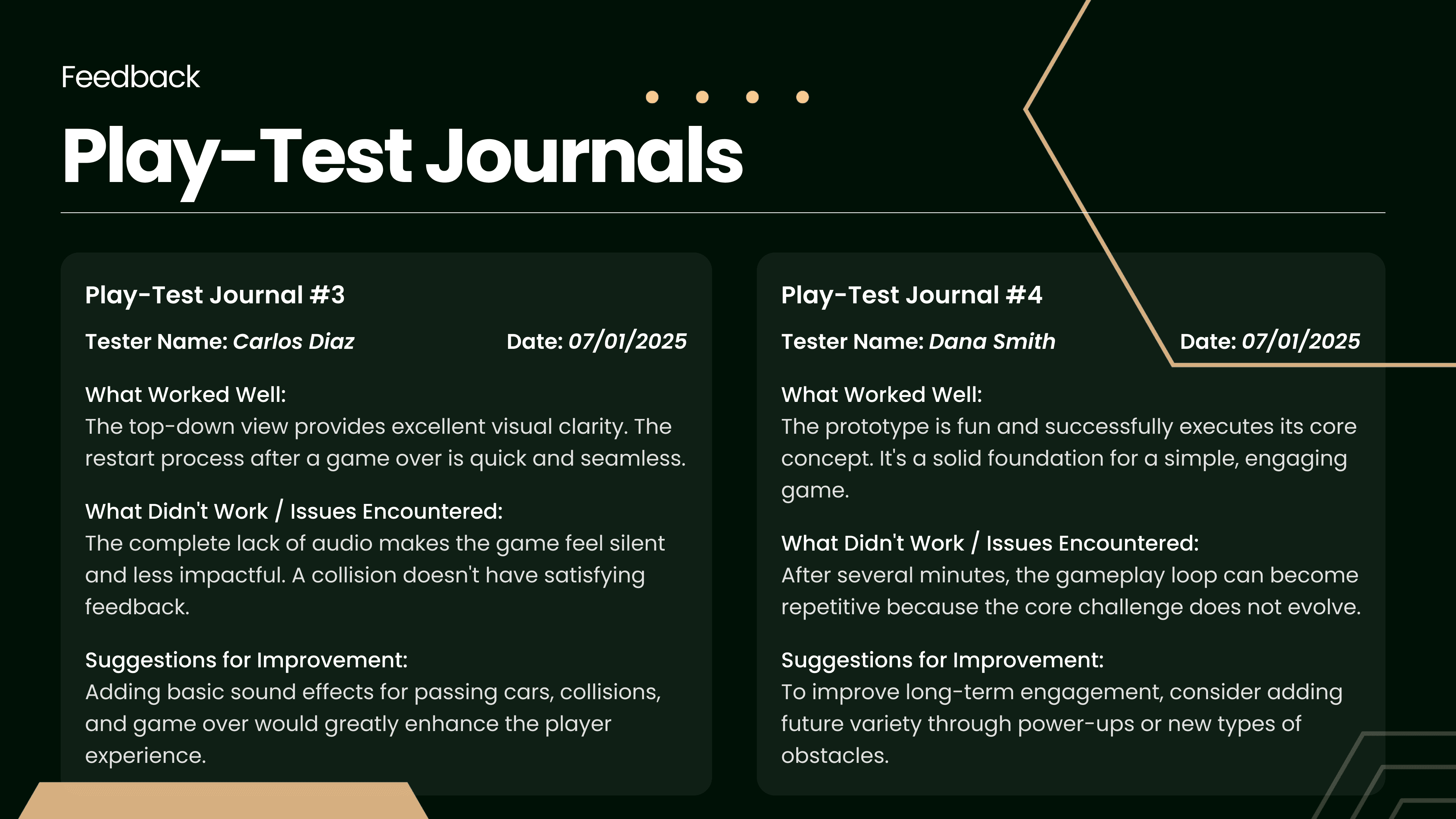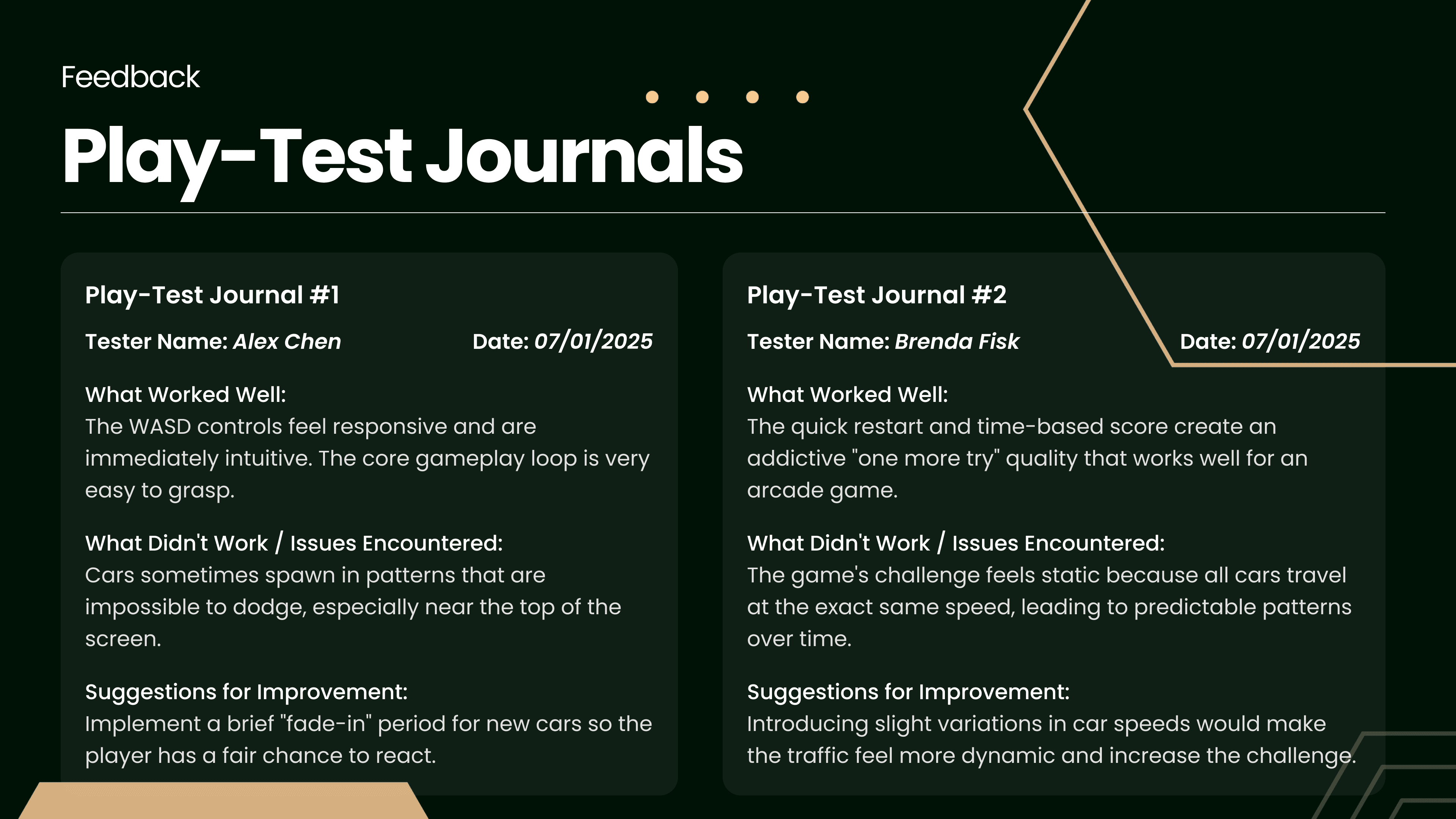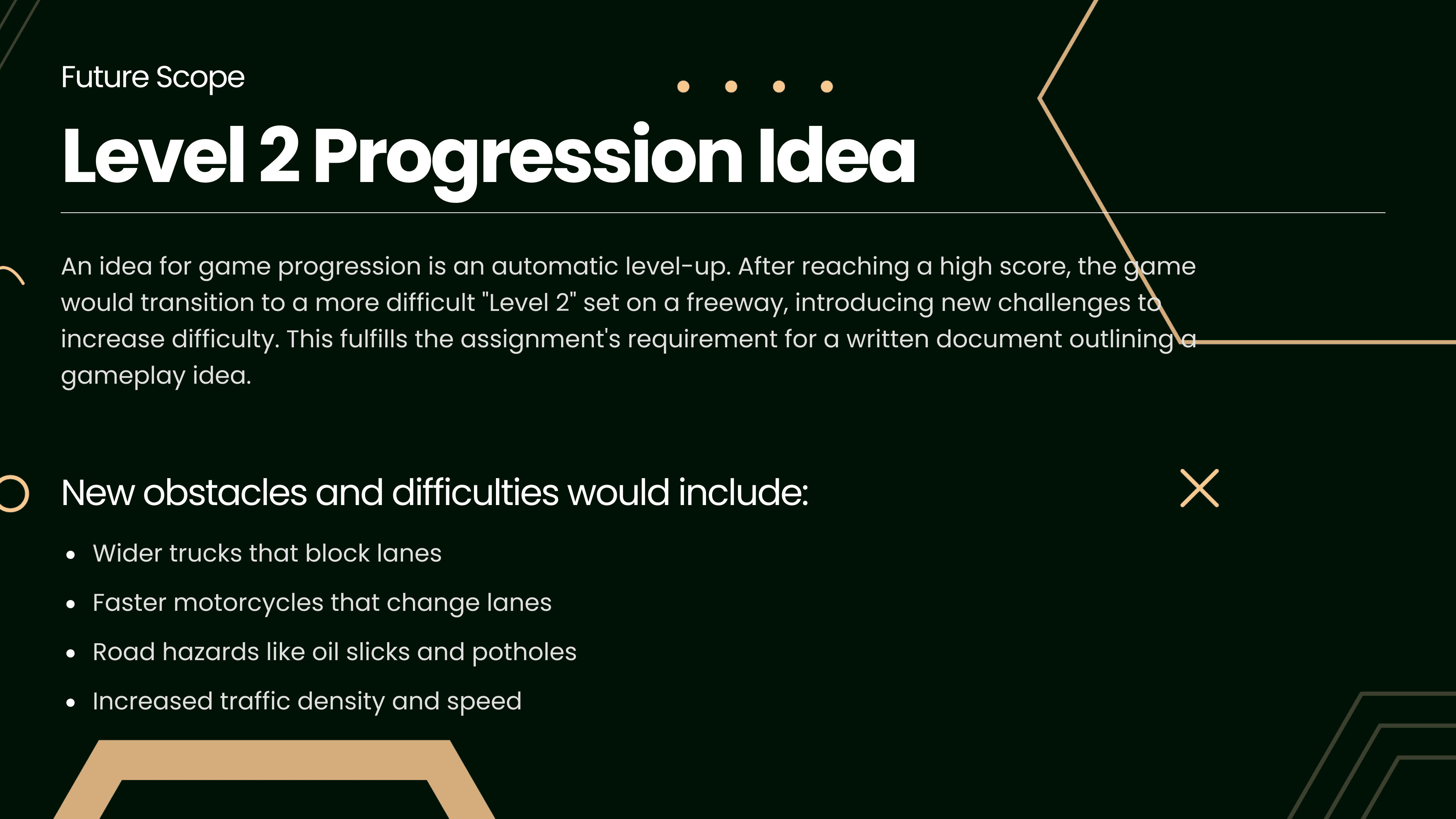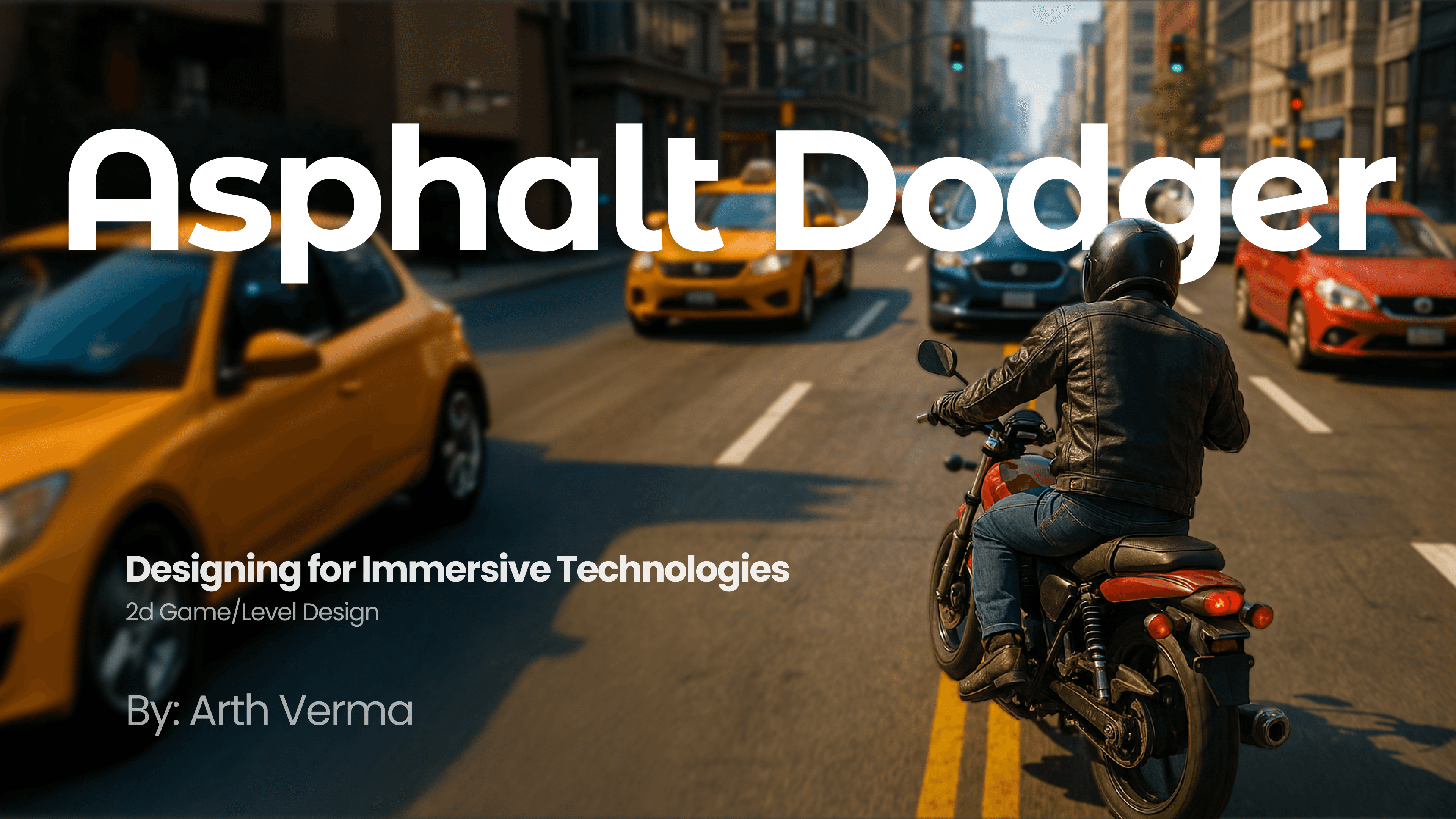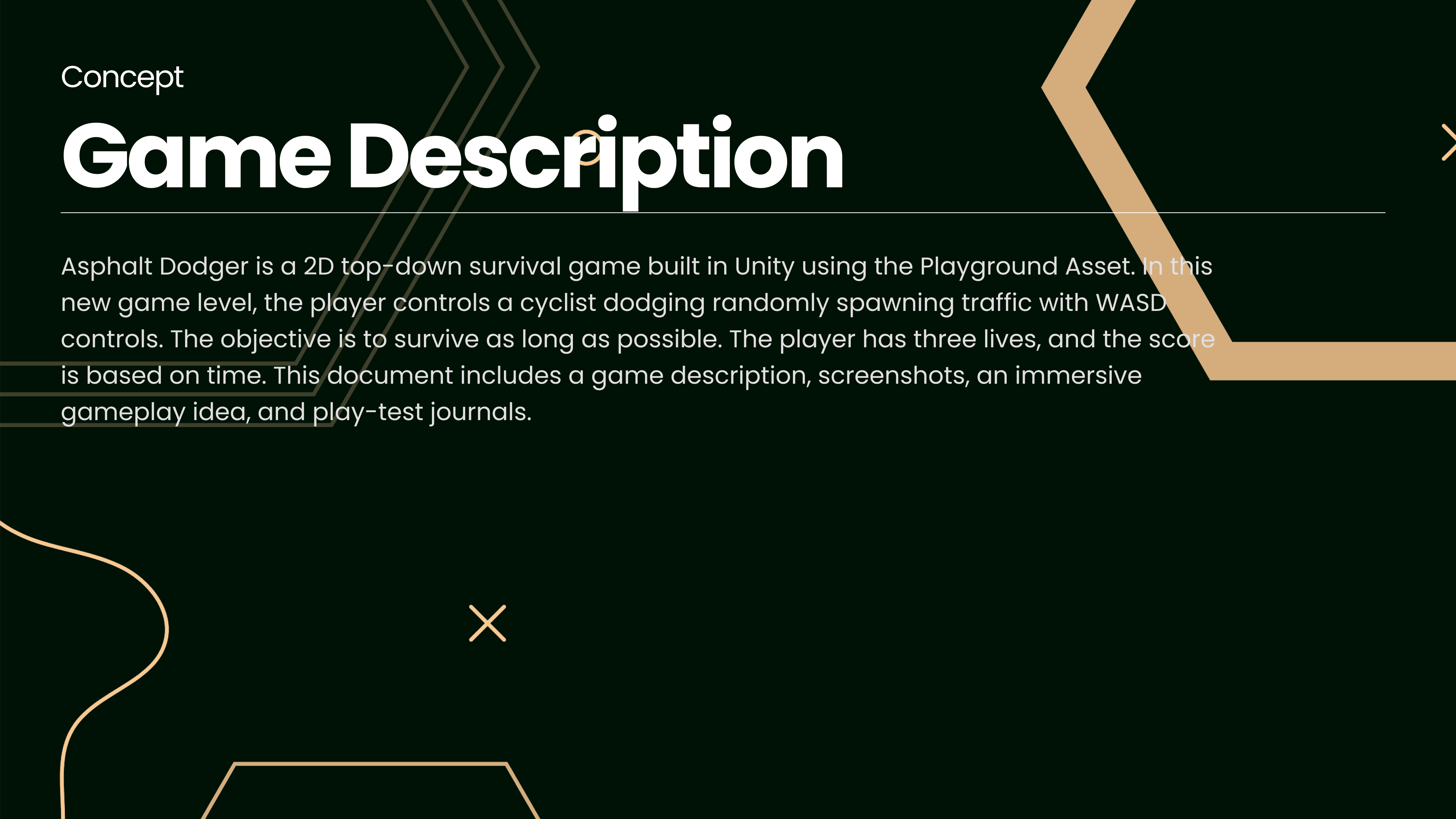 This presentation documents the concept, level design, and play-test feedback for "Asphalt Dodger," a 2D top-down survival game built in Unity. The project outlines the core gameplay loop, ideas for future scope, and the critical results of early user testing.