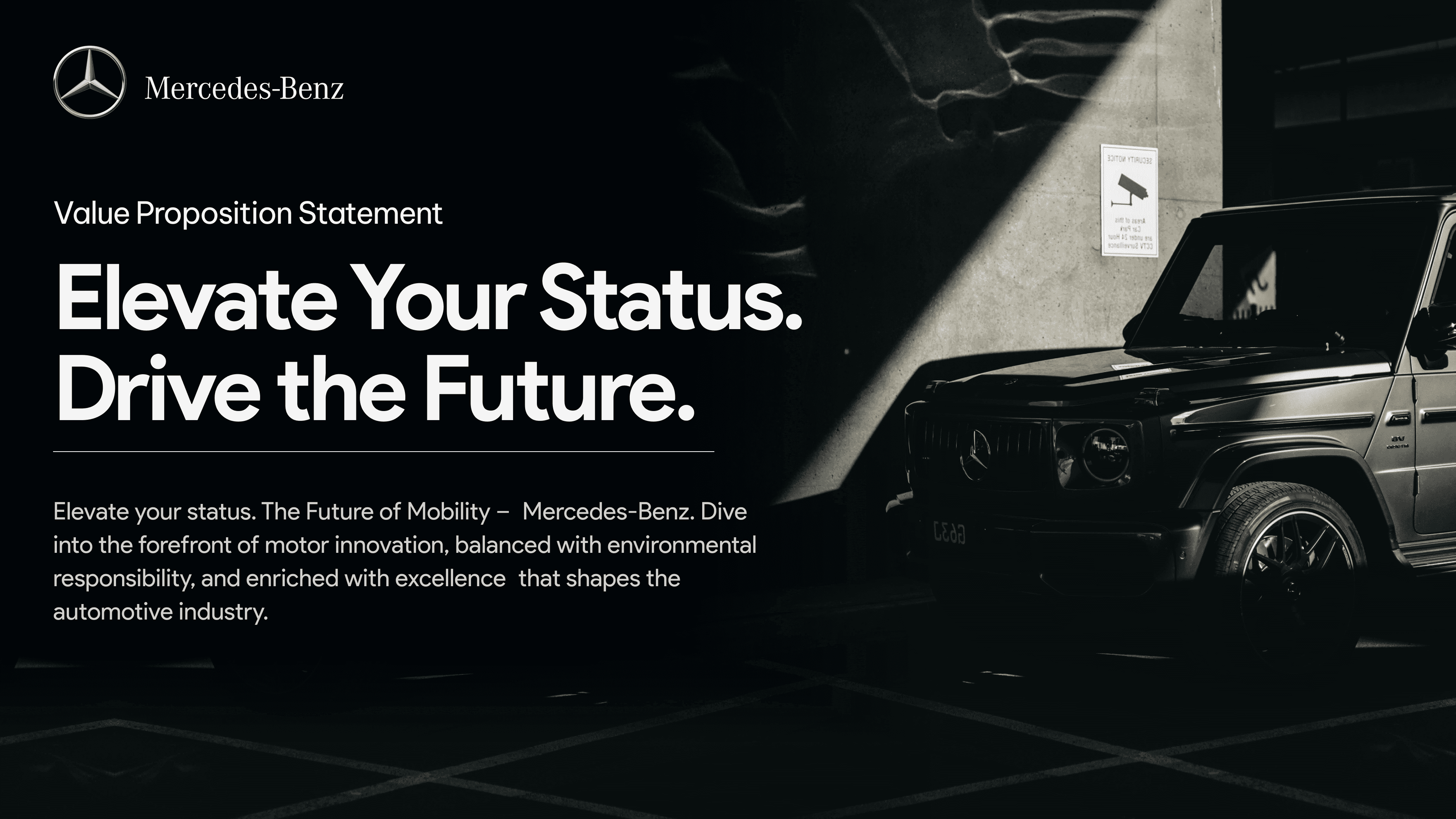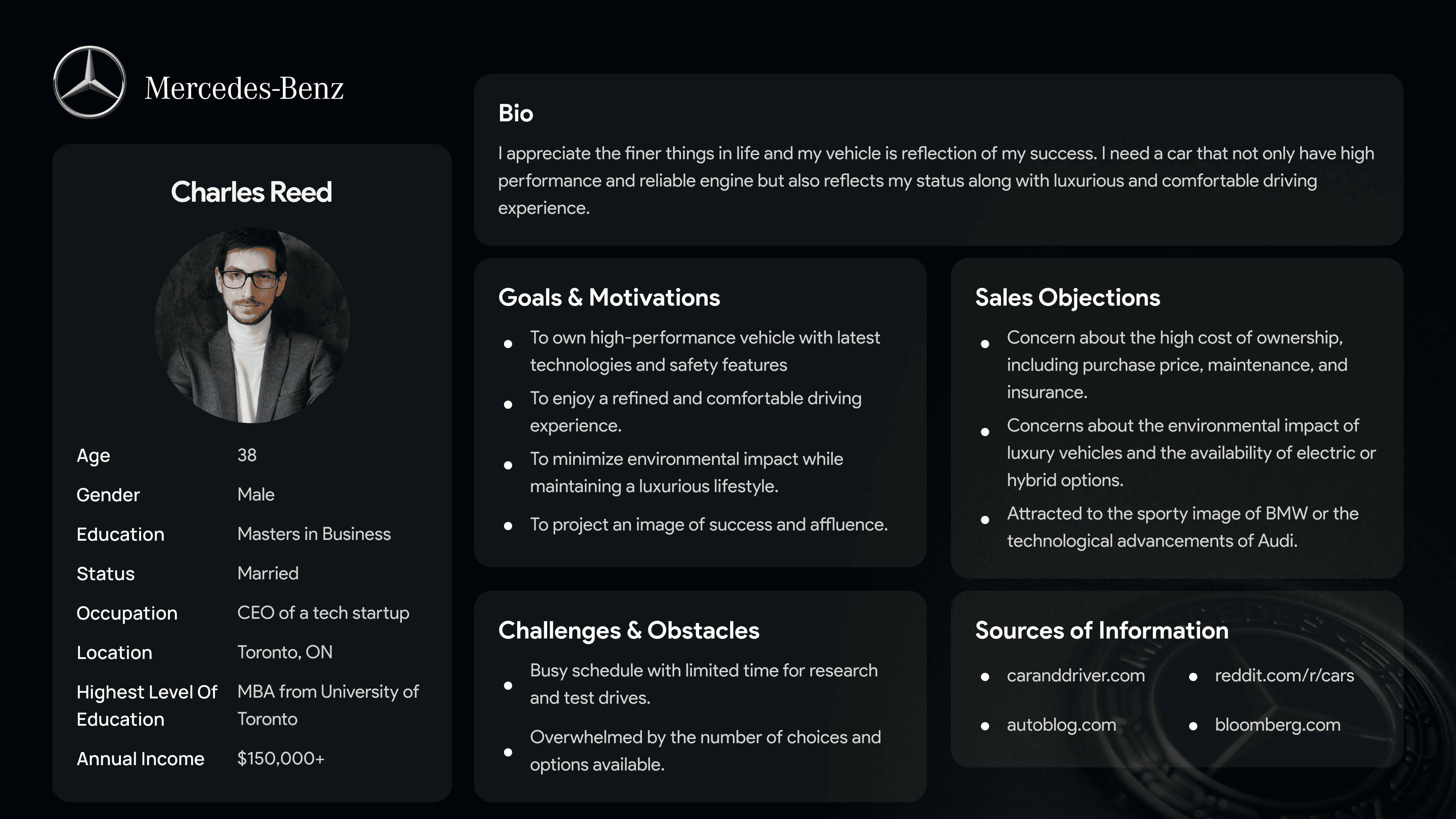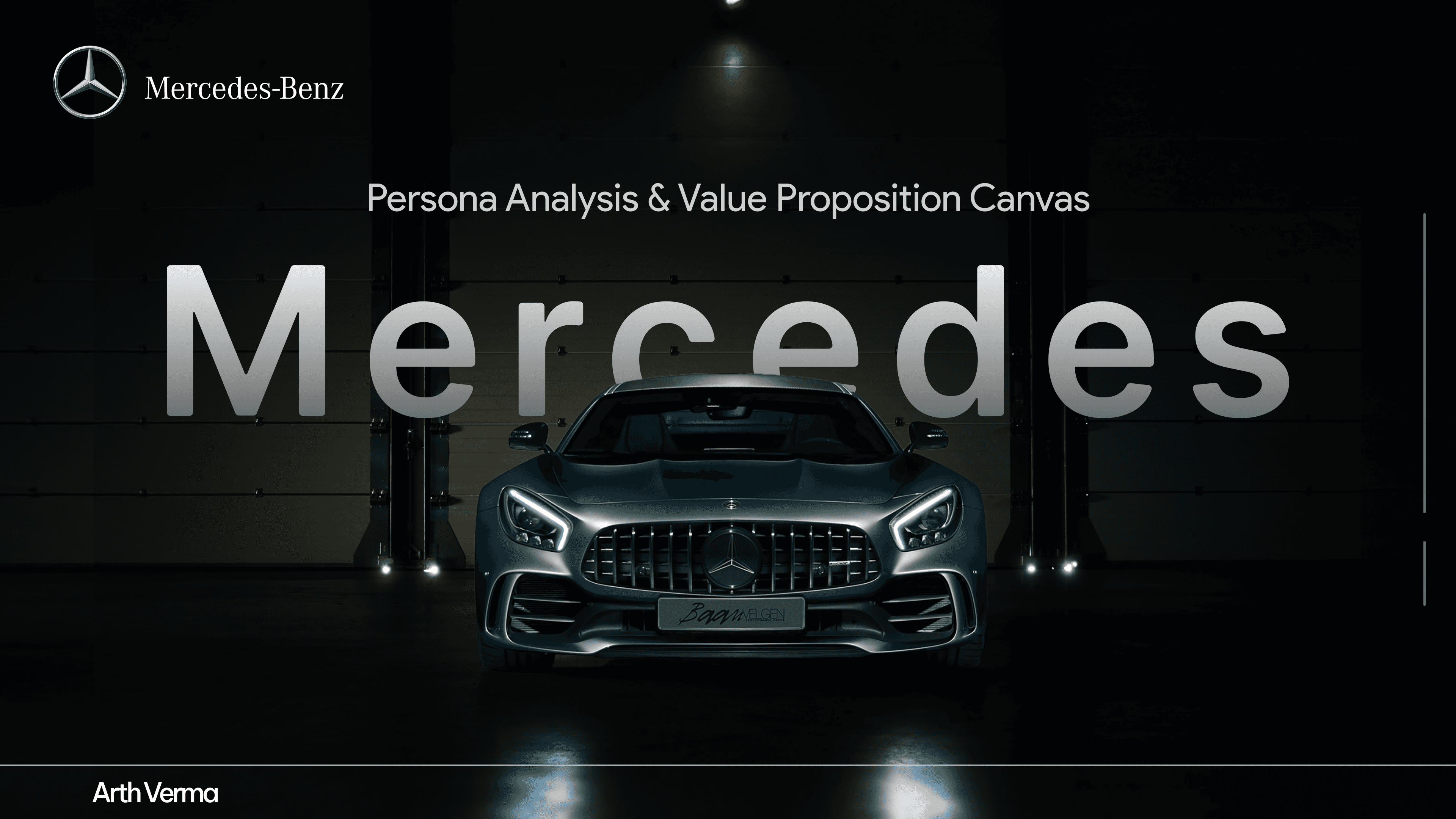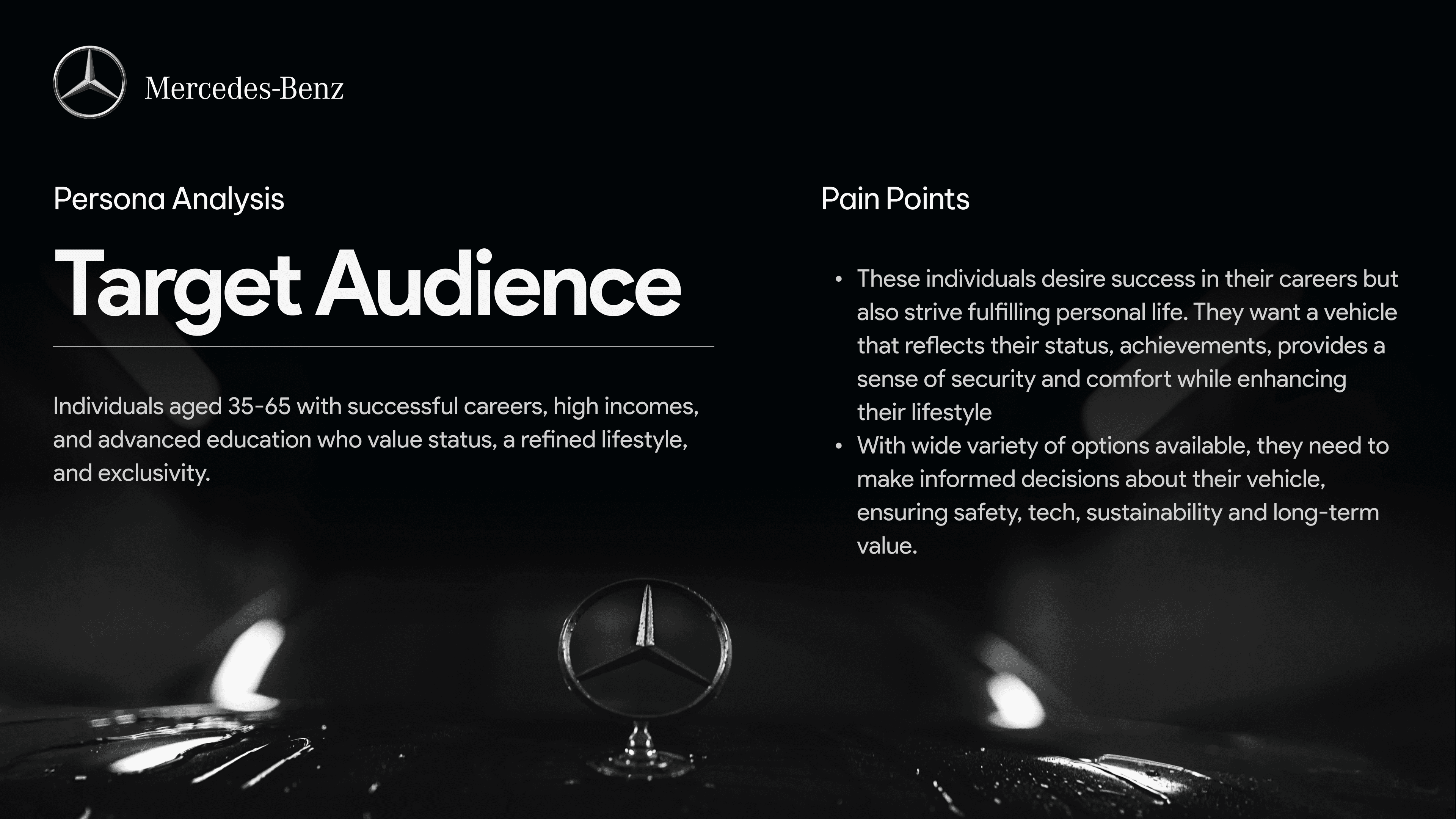 This presentation is a deep-dive strategic analysis of the luxury automotive brand Mercedes-Benz. The document identifies the brand's target audience and pain points, culminating in a detailed user persona and a Value Proposition Canvas to clarify its market position.